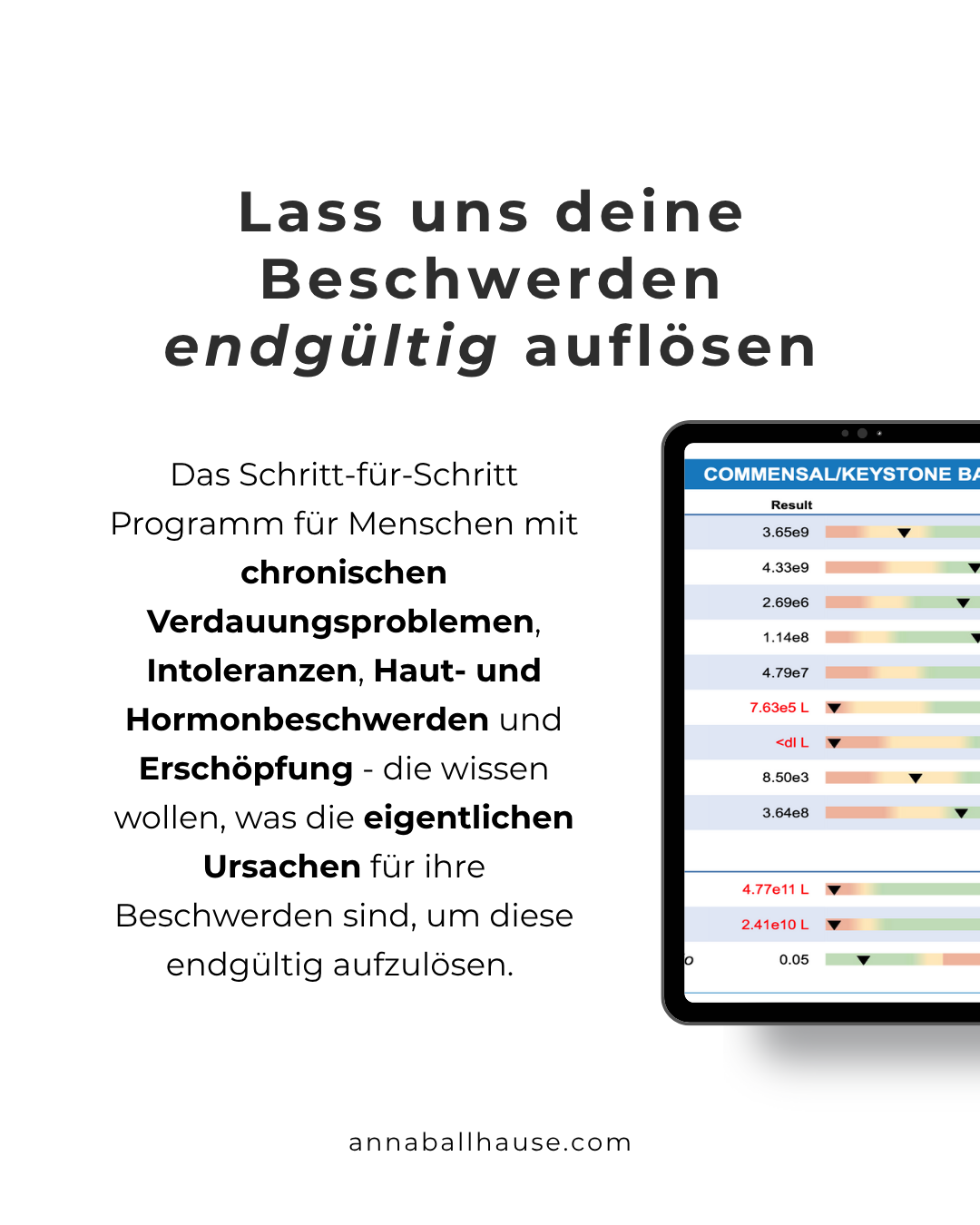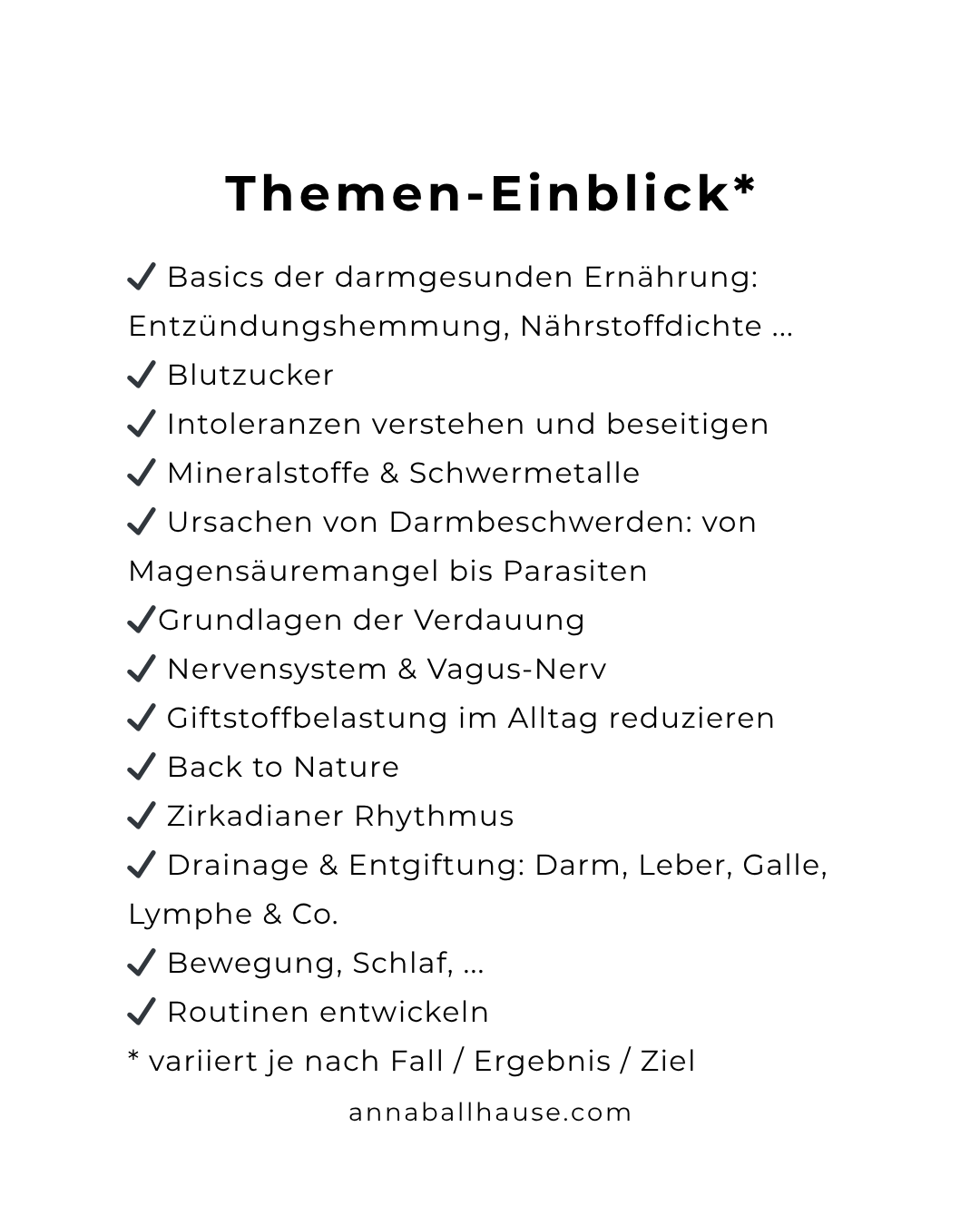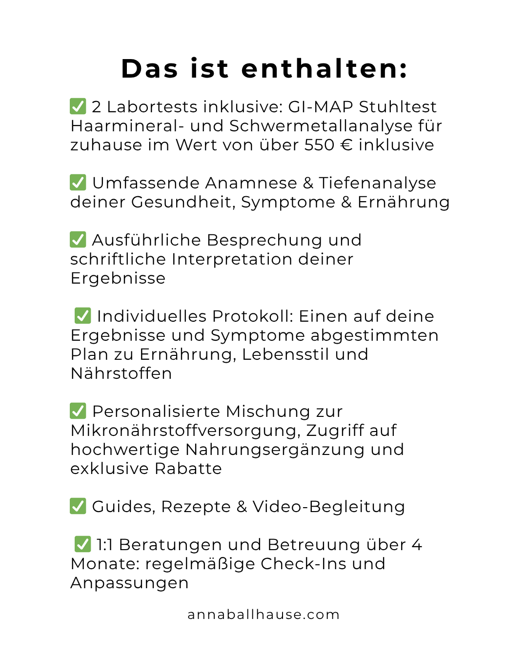 - Video-Call zur gemeinsamen Analyse deiner Symptome, ersten Hypothesen und Ernährung
